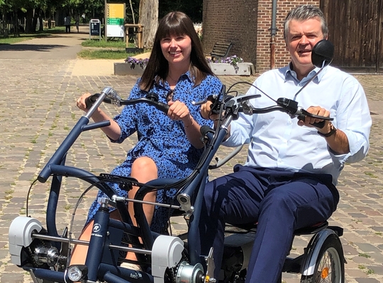 De stad Hasselt kocht voor dit project twee speciaal aangepaste elektrische fietsen aan. “Het gaat om een rolstoelplateaufiets en een duofiets. Bij een rolstoelplateaufiets kan je gewoon in je rolstoel blijven zitten. Zo kan je je gemakkelijk verplaatsen bij een tussenstop. De bijrijder kan de persoon in de rolstoel eenvoudig op en af het plateau rijden. Bij een duofiets zitten de fietsers langs elkaar op een tandem met drie wielen. Eén persoon stuurt en beiden kunnen trappen,” vertelt schepen van de Hasselaar Dymfna Meynen, die ook bevoegd is voor toegankelijkheid.